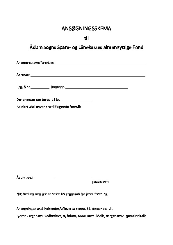 Under almennyttige formål forstås også støtte til erhvervs- og byudvikling, der sigter mod at opretholde og øge det nødvendige befolkningsunderlag til bevarelse af pastorat, skole, samlingssteder samt nærbutikker m.m. i Ådum.