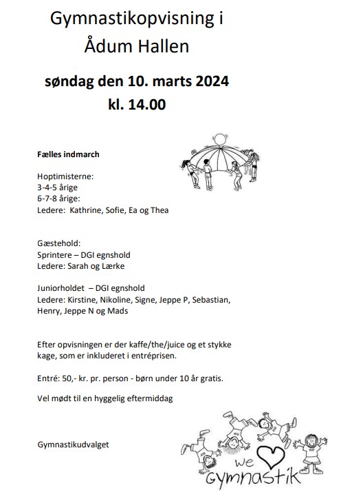 Kom til gymnastikopvisning den 10. marts i Ådum Hallen torsdag d. 7. marts 2024, kl. 17:12 af Lone Bech i kategorien Nyheder.